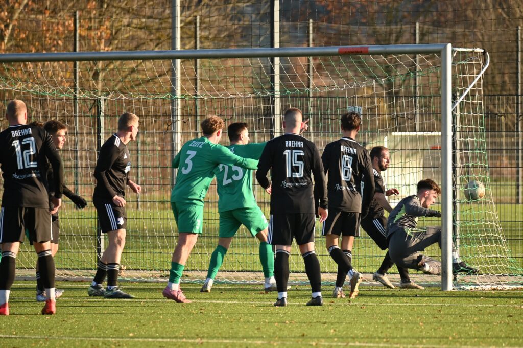 Unser Team machte weiter Druck und in der 28. Minute half dann der Gästehüter kräftig mit, das Ergebnis in Richtung Zeitz zu erhöhen. Einen Eckball wollte er aufnehmen, legte sich die Kugel aber selber ins Netz. Die Proteste der Brehnaer waren ohne Erfolg, denn da war rein gar nichts was den überzeugenden Referee bewegen konnte das Tor nicht zu geben.